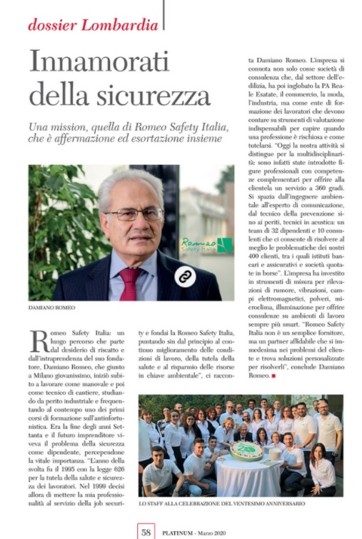 Damiano Romeo racconta “Quando fondai la Romeo Safety Italia ventuno anni fa, cercai sin dal principio di puntare al continuo miglioramento delle condizioni di lavoro, della tutela della salute” e aggiunge “Anche se oggi stiamo vivendo un momento nazionale difficile ci risolleveremo e saremo più forti di prima, tutti insieme”.